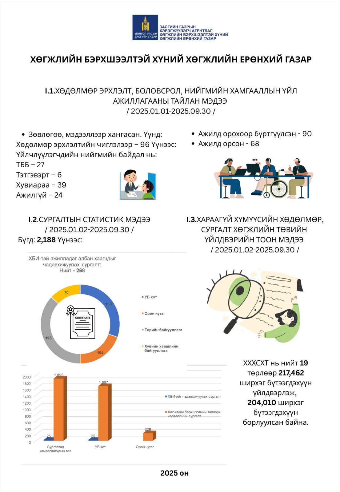 ХӨГЖЛИЙН БЭРХШЭЭЛТЭЙ ХҮНИЙ ХӨГЖЛИЙН ЕРӨНХИЙ ГАЗАР ТӨРИЙН ЖИНХЭНЭ АЛБАН ХААГЧИЙГ ШИЛЖҮҮЛ... 2025-10-14 20073ОЛОН УЛСЫН ЗАХ ЗЭЭЛД ХӨГЖЛИЙН БЭРХШЭЭЛТЭЙ ИРГЭД, АСРАН ХАМГААЛАГЧДЫН ҮЙЛДВЭРЛЭСЭН БАРАА, БҮТЭЭГДЭХҮҮНИЙГ СУРТАЛЧЛАН ТАНИУЛАХ, ҮЗЭСГЭЛЭН ХУДАЛДААНД ОРОЛЦУУЛАХ БҮТЭЭГДЭХҮҮНИЙГ СОНГОН ШАЛГАРУУЛАХ ЗАР